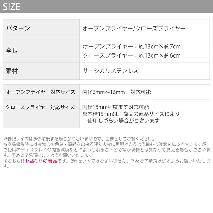 オープンプライヤー:約13cm×約7mm クローズプライヤー:約13cm×約6mm
