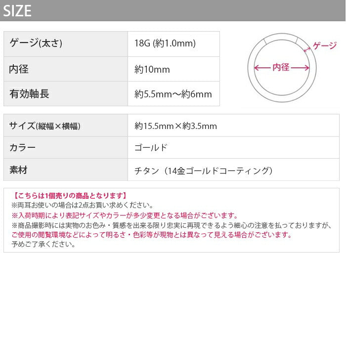 18G ピアス キャッチレス フープピアス 金属アレルギー チタン 14K ゴールド 軟骨1338 ch-135