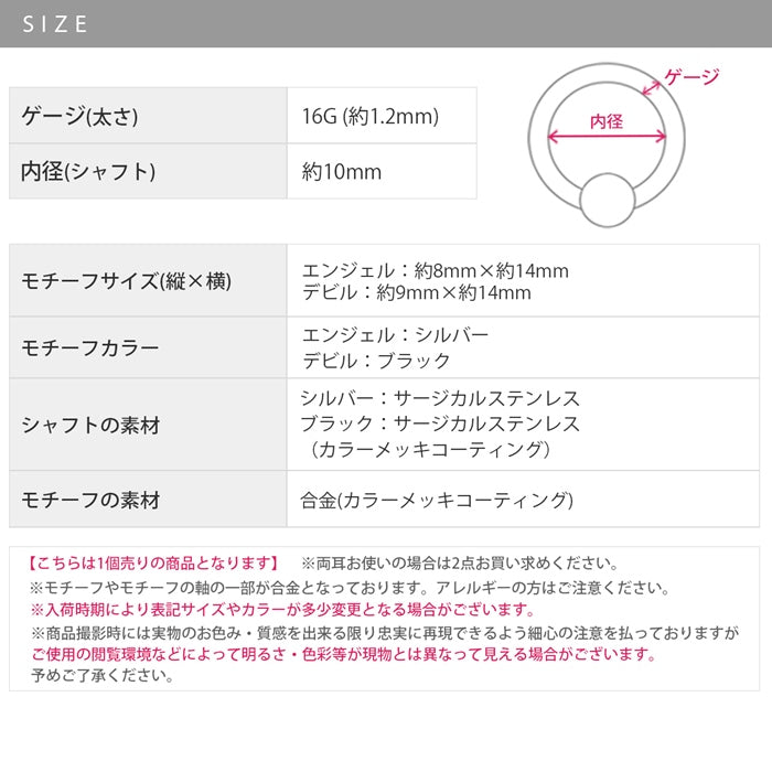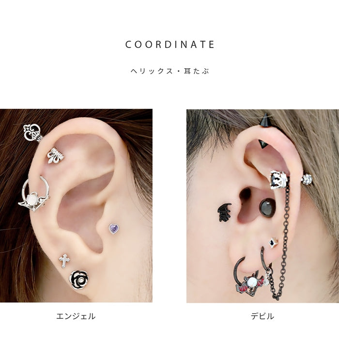 ch-140 ボディピアス 16G 軟骨ピアス サージカルステンレス 金属アレルギー対応 エンジェル デビル つけっぱなし シルバー ブラック ジュエル セグメントクリッカー ピアス ワンタッチ ヘリックス ヘリックスピアス 耳たぶ 耳 片耳用
