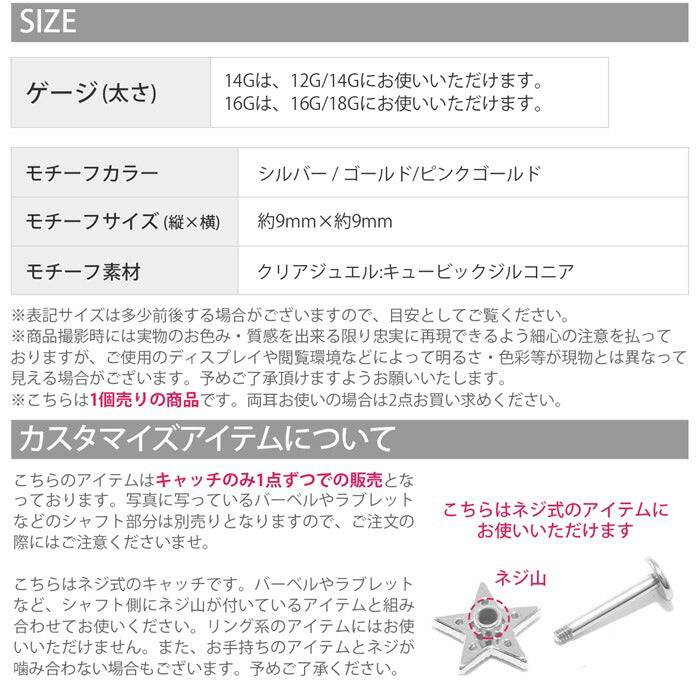 14G 16G 18G 12G ジュエル スター キャッチ キュービックジルコニア 片耳用 キャッチ0239 ch-91