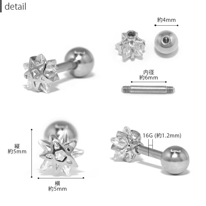 16G 星 スター レイヤード キュービックジルコニア ストレートバーベル ボディピアス 軟骨1378 d-018