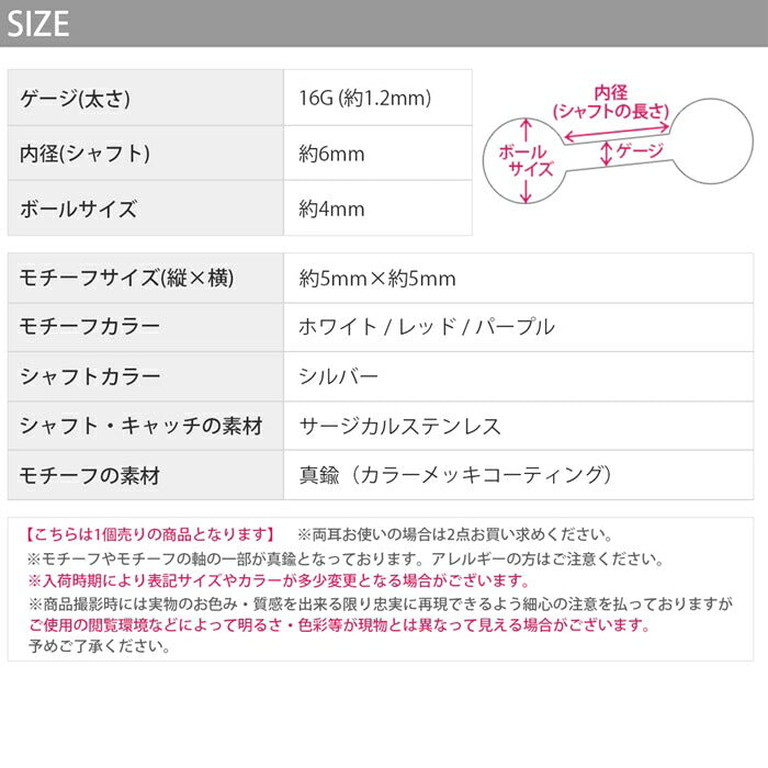d-022 ボディピアス 軟骨ピアス 16G ハート サージカルステンレス 金属アレルギー対応 ファーストピアス セカンドピアス トラガス つけっぱなし 片耳用 ホワイト レッド パープル 軟骨 ピアス ボディーピアス かわいい レディース シンプル