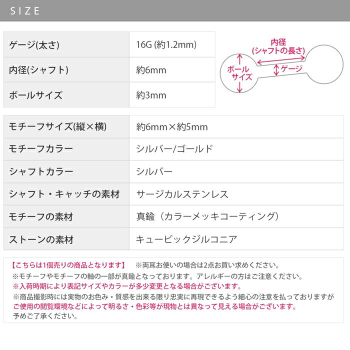 16G ボディピアス 軟骨ピアス 月 ムーン 星 キュービックジルコニア ストレートバーベル 軟骨1408 d-032