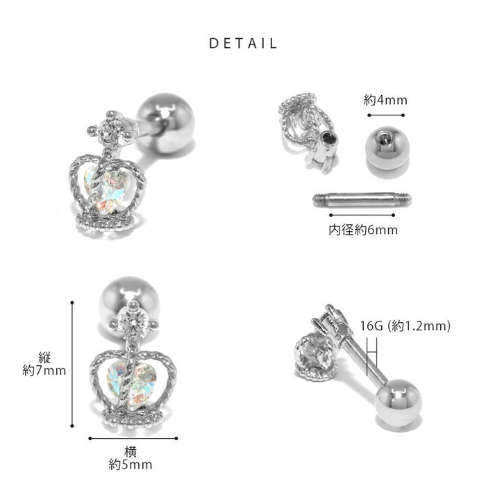 d-033 軟骨ピアス 16G ボディピアス サージカルステンレス つけっぱなし 金属アレルギー対応 王冠 クラウン ストレートバーベル セカンドピアス レディース メンズ なんこつぴあす かわいい シルバー オーロラ レッド パープル 片耳用