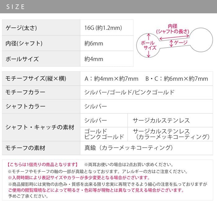 16G リボン ストレートバーベル シルバー ピンクゴールド 片耳用 軟骨1416 d-035
