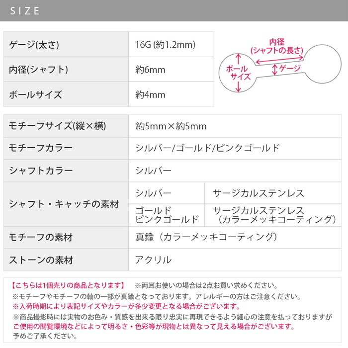シルバー:サージカルステンレス ゴールド・ピンクゴールド:サージカルステンレス(カラーメッキコーティング)