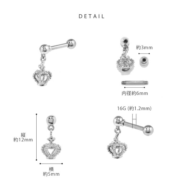 16G ボディピアス 王冠 クラウン ストレートバーベル 軟骨チャーム付0224 d-038