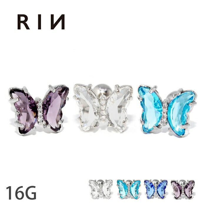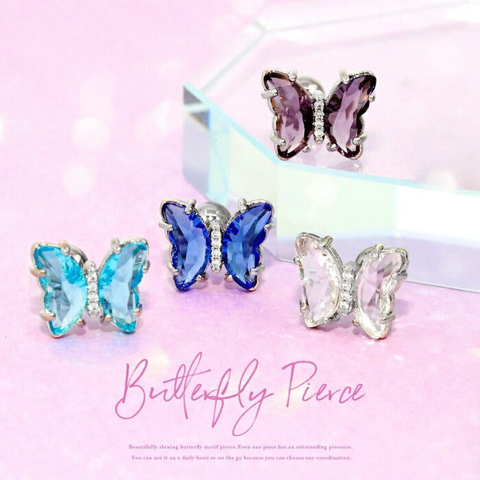 軟骨ピアス 16G ボディピアス かわいい ストレートバーベル サージカルステンレス 金属アレルギー対応 蝶々 ジュエル バタフライ キラキラ おしゃれ レディース シルバー クリア オーロラ ライトブルー ブルー パープル 片耳用 耳たぶ 真鍮
