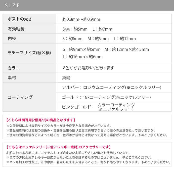※ゴールドやブラック、ピンクゴールド等のカラーコーティング素材は、体質によって長時間つけたままにされますとコーティング素材が剥がれやすくなる可能性がございます。※ニッケルフリー素材は全ての方に金属アレルギーが出ないことを保証するものではございません。