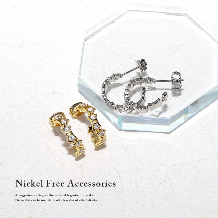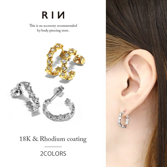 fp-016 ピアス フープピアス 金属アレルギー ニッケルフリー 真鍮 18kコーティング 星 ストーン キラキラ キャッチ シンプル レディース おしゃれ かわいい シルバー ゴールド 上品 きれいめ 耳たぶ 【両耳用・2個売り】