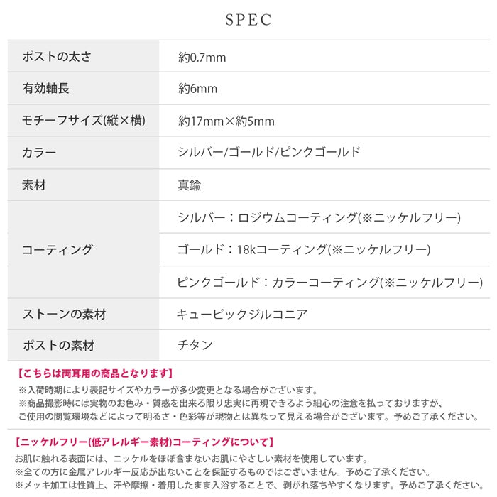 | コーティング | シルバー:ロジウムコーティング(※ニッケルフリー) ゴールド:18kコーティング(※ニッケルフリー) ピンクゴールド:カラーコーティング(※ニッケルフリー) |