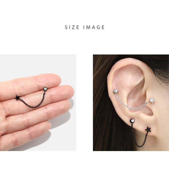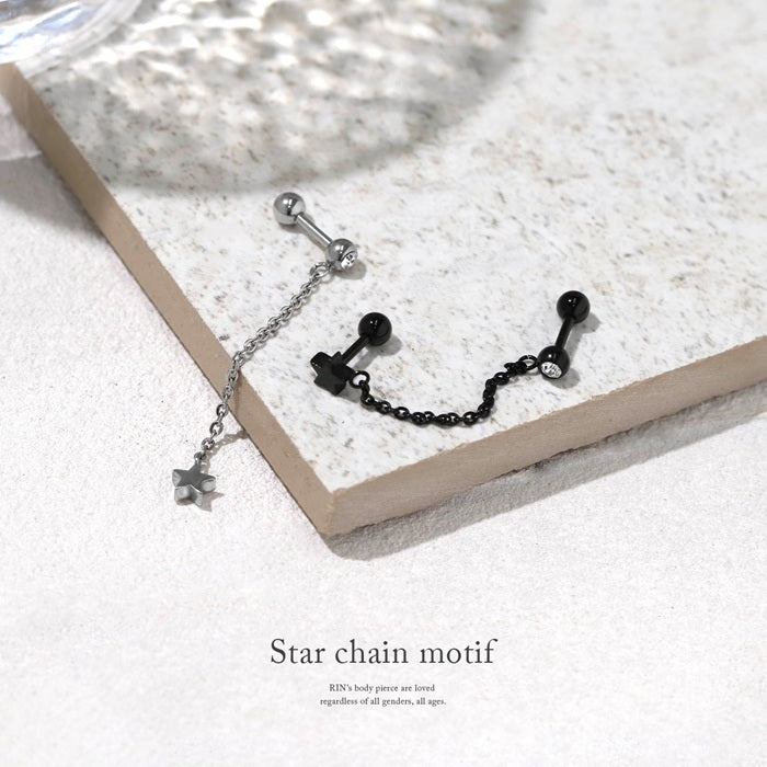 j1181-58 軟骨ピアス 16G ボディピアス かわいい 星 スター ジュエル チェーン キャッチ チャーム サージカルステンレス 金属アレルギー対応 シルバー ブラック ストレートバーベル Wバーベル チェーンピアス おしゃれ メンズ アレンジ お出かけ 軟骨 ピアス 片耳用