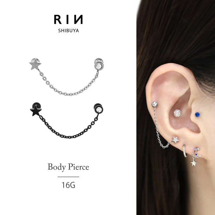16G スター チェーン ジュエル Wバーベル ボディピアス ストレートバーベル 片耳用 軟骨チャーム付0096 j1181-58