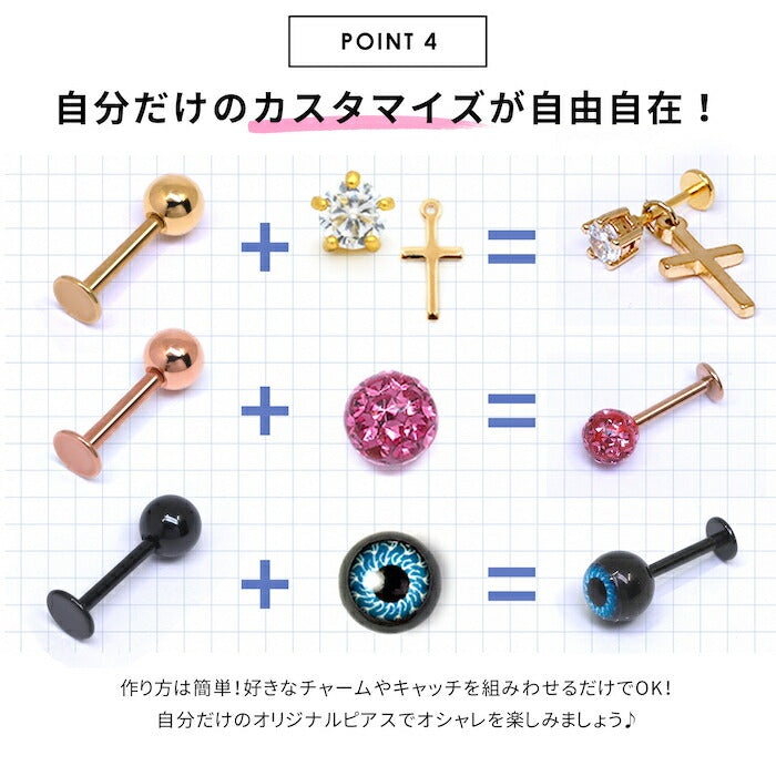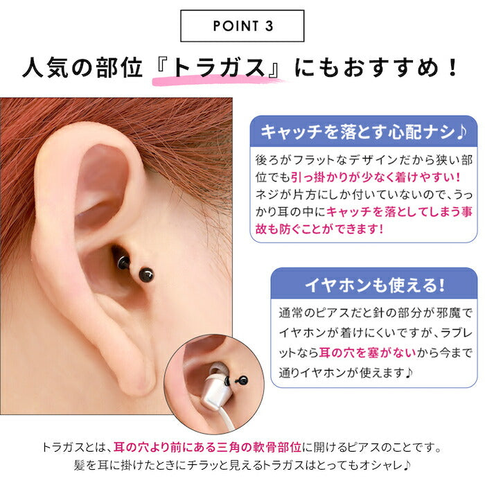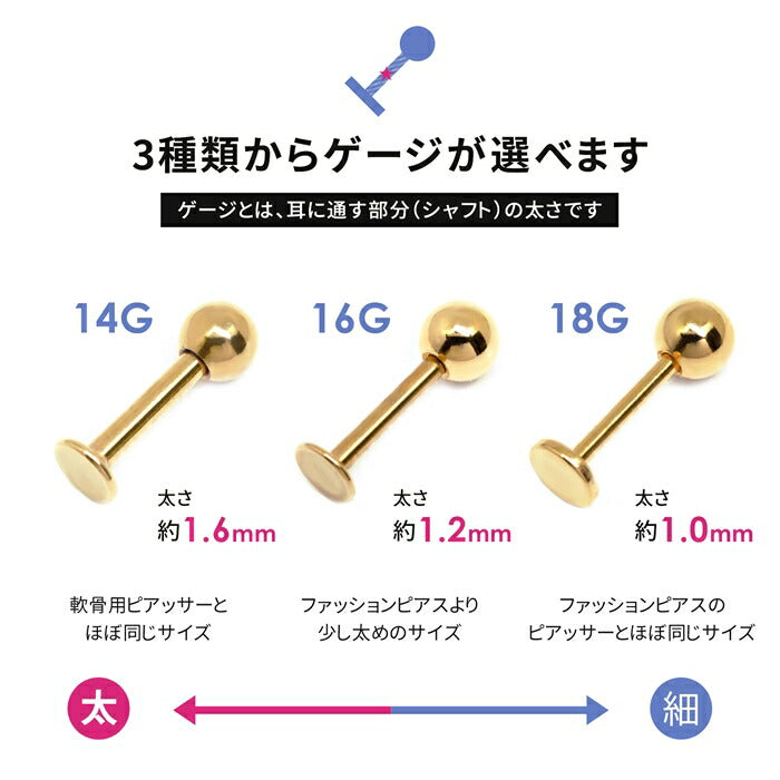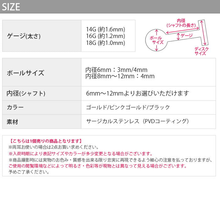 | ◆金属アレルギー対応 金属アレルギー反応が起きにくい、高品質サージカルステンレス素材を使用! ◆ゲージサイズ 耳たぶのファーストピアスにおすすめの16G 軟骨ピアスのファーストピアスにおすすめの14G ファッションピアスにおすすめの18G とお好きなゲージサイズをお選びいただけます。 ◆内径サイズ 4種類から選べるラブレット。 6mm・8mm・10mm・12mmからお好きなサイズが選択可能。 ◆カラー 3種類から選べるラブレット。 ◆キャッチサイズ ボールサイズは、3mm・4mmからお選びいただけます。 |