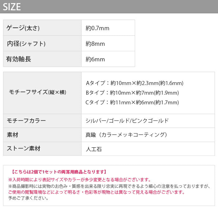 ※こちらの商品の一部カラーは、カラーのメッキコーティングを施しています。体質によって着けたままにされますと、メッキコーティングが剥がれる可能性がございます。