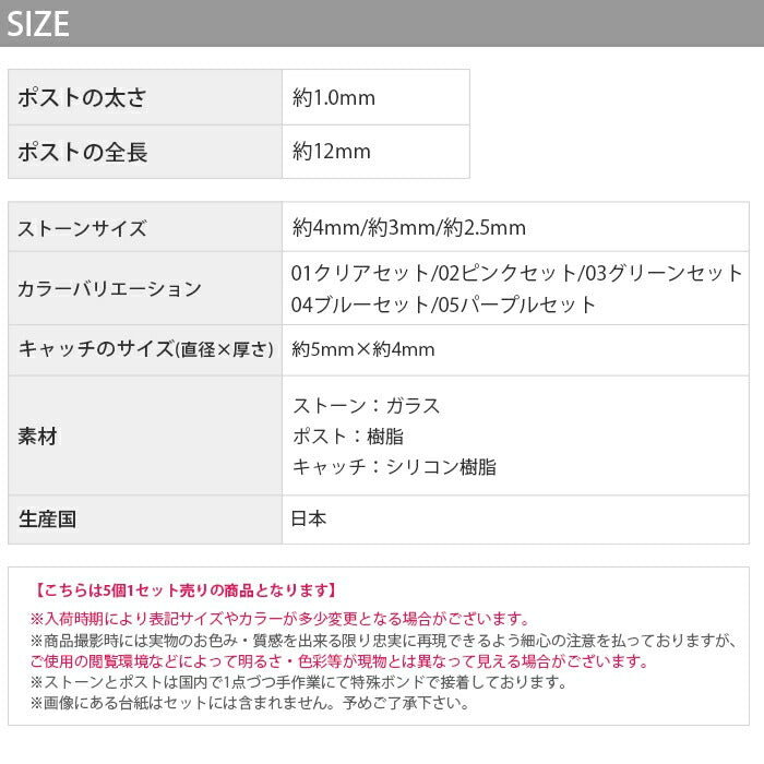 ピアス 5個セット シリコン キャッチ ガラス ストーン 樹脂 アクセサリーカテ0009 mmj-004