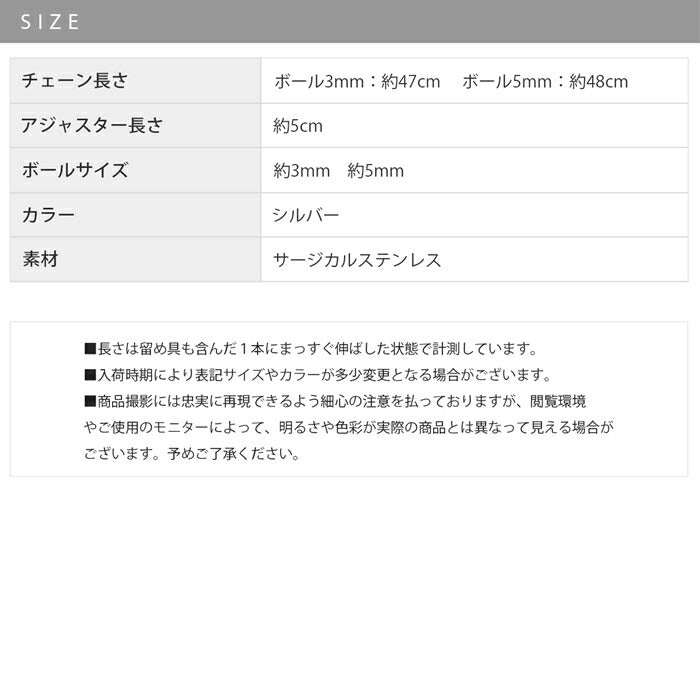 nec-112 ネックレス チェーン チェーンネックレス ボールチェーン サージカルステンレス レディース メンズ 金属アレルギー 金属アレルギー対応 つけっぱなし チェーンのみ チェーンだけ アジャスター アジャスター付き 47cm 48cm シルバー シンプル アクセサリー