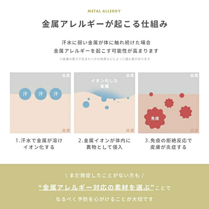 ※水濡れ・汗等は色落ち、変色の原因となりますので水分が付着する可能性がある場合には必ずお外しください。アレルギーには個人差があり、必ずしもアレルギーが出ないとは限りません。