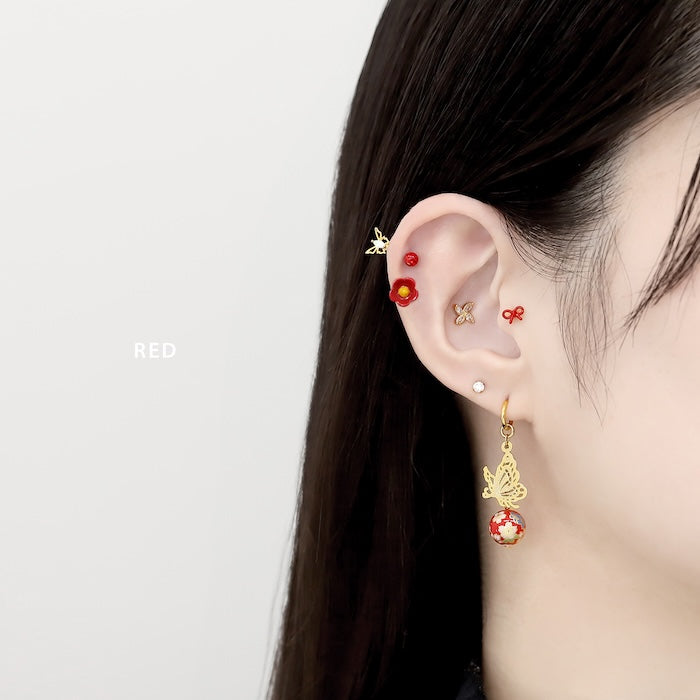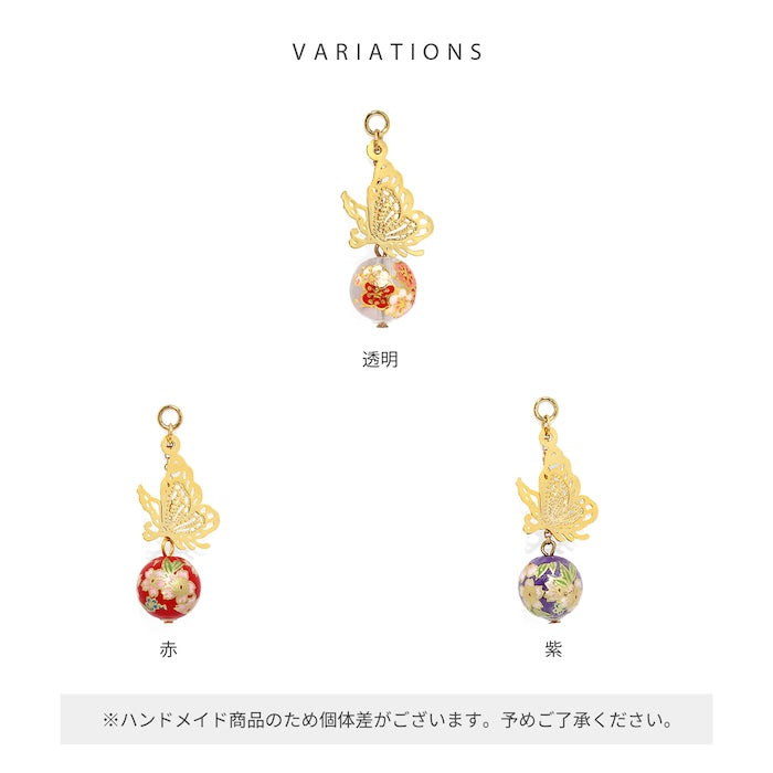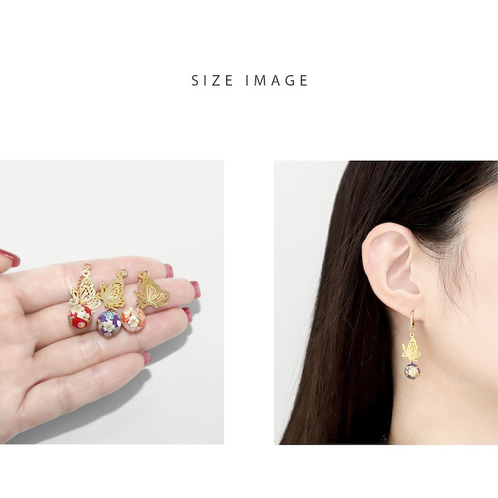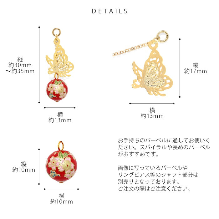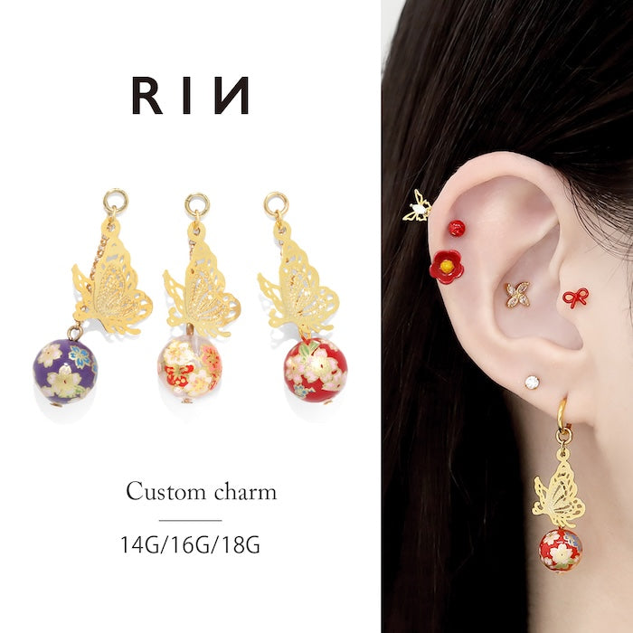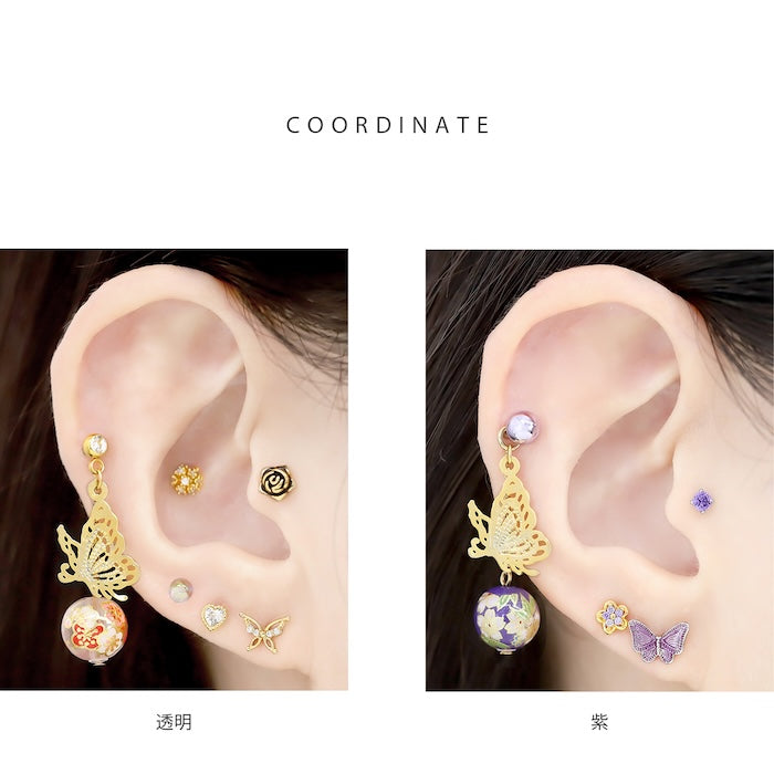 ori-148 ボディピアス 14G 16G 18G 軟骨ピアス チャーム 毬 鞠 蝶 蝶々 バタフライ チェーン 和 和風 透明 赤 紫 クリア レッド パープル