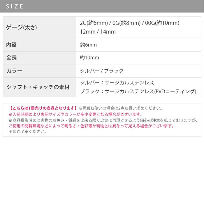 2G(約6mm) 0G(約8mm) 00G(約10mm) 12mm 14mm