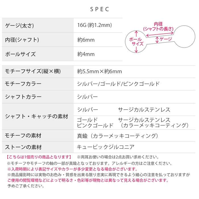 | シャフト・キャッチの素材 | シルバー:サージカルステンレス ゴールド ピンクゴールド:サージカルステンレス(カラーメッキコーティング) |