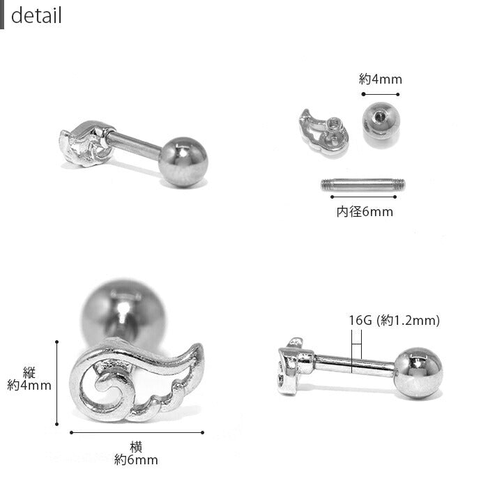 【両耳用・左右ペア】軟骨ピアス 16G 天使 翼 羽 ウイング ストレートバーベル rin-001-2