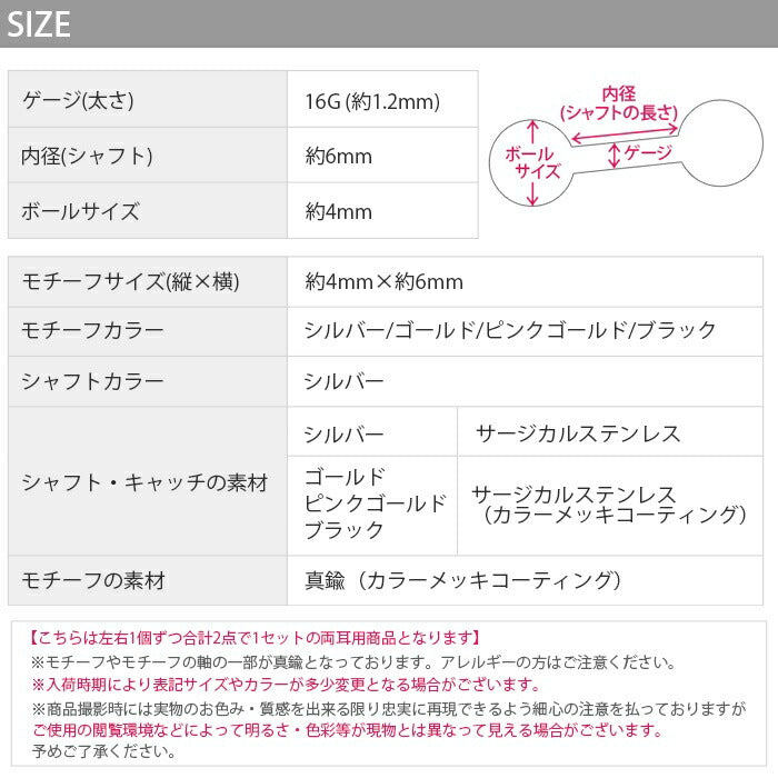 ※こちらの商品の一部カラーは、カラーのメッキコーティングを施しています。体質によって着けたままにされますと、メッキコーティングが剥がれる可能性がございます。