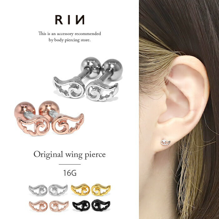 rin-001-2 軟骨ピアス 16G かわいい ピアス ボディピアス 天使 翼 羽 ウイング 金属アレルギー対応 ストレートバーベル サージカルステンレス 軟骨用 ヘリックス シルバー ゴールド ピンクゴールド ブラック シンプル ボディピ左右セット 耳たぶ用 【両耳用・左右ペア】