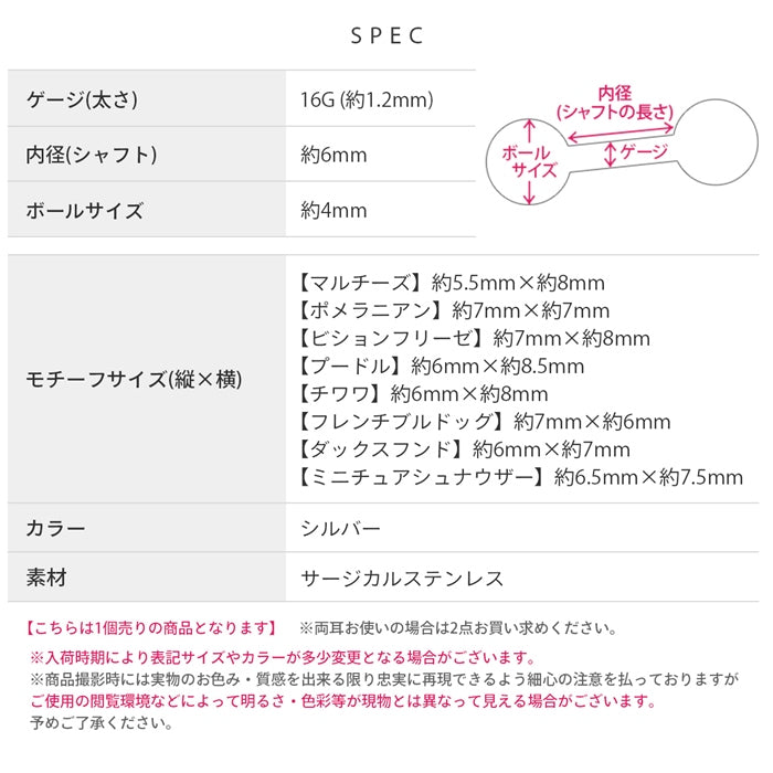 rin-017 軟骨ピアス 16G ボディピアス 犬 ドッグモチーフ 顔 かわいい オールサージカルステンレス アレルギー対応 ストレートバーベル ピアス 片耳用