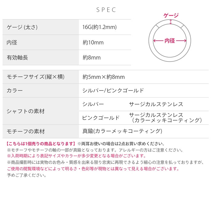 | シャフトの素材 | シルバー:サージカルステンレス ピンクゴールド:サージカルステンレス(カラーメッキコーティング) |