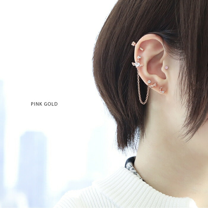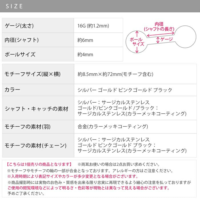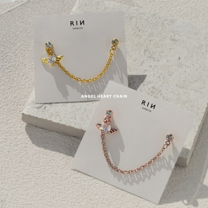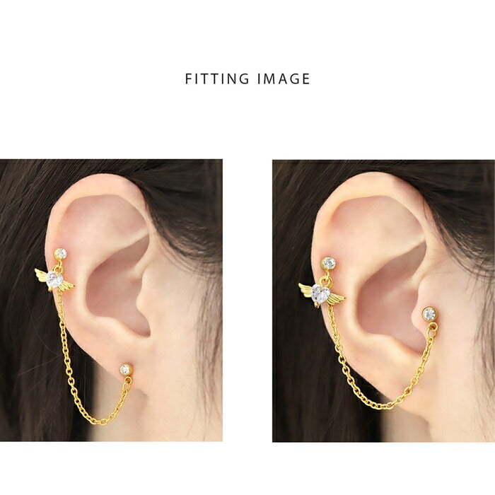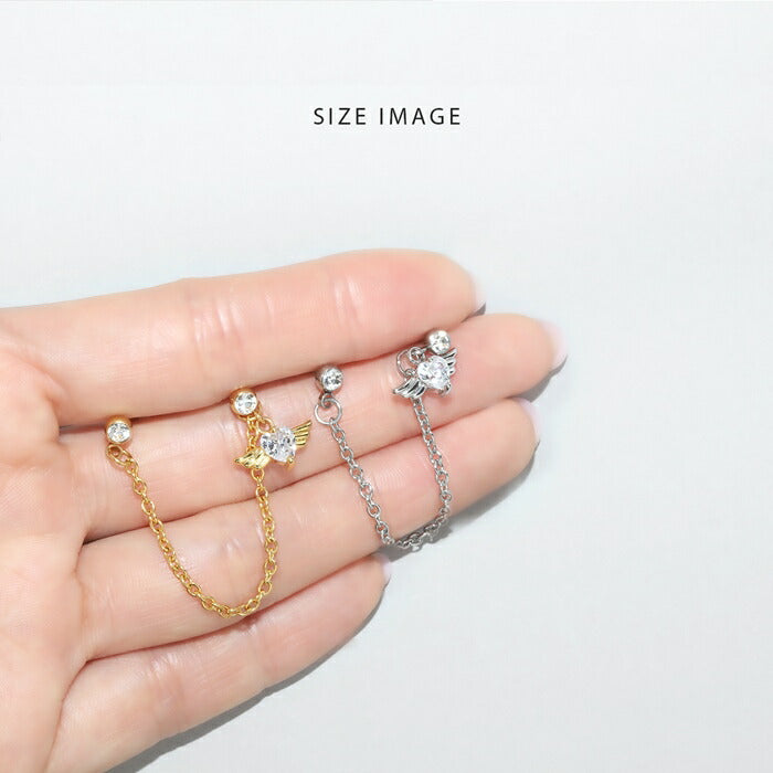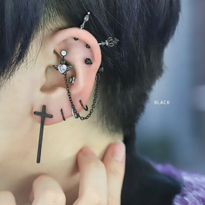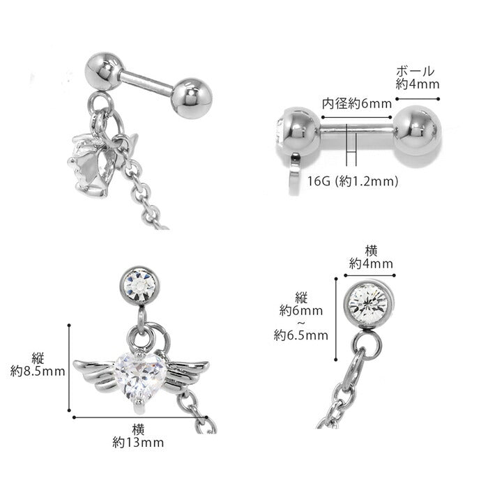 rin-set-007 ボディピアス 16G 軟骨ピアス サージカルステンレス 金属アレルギー対応 金属アレルギー チェーン つけっぱなし エンジェル 羽 翼 ハート シルバー ゴールド ピンクゴールド ブラック ジュエル ピアス 揺れる ストレートバーベル 片耳用