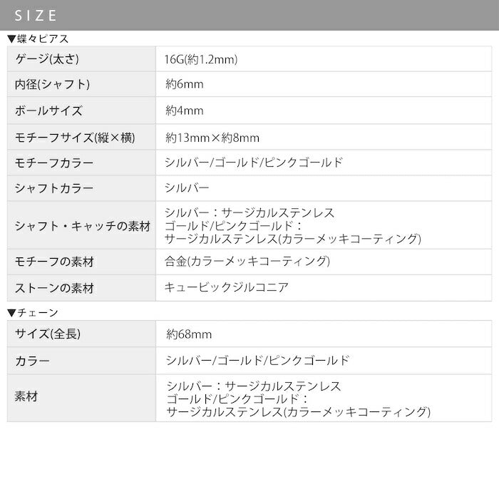【14G】rin-set-010 ボディピアス 14Gリング チェーン 軟骨ピアス 金属アレルギー 金属アレルギー対応 蝶 バタフライ ピサージカルステンレス ステンレス ジュエル パーツ リング フープ カスタムピアス カスタム カスタマイズ 揺れる シルバー ゴールド ピンクゴールド セット 片耳用