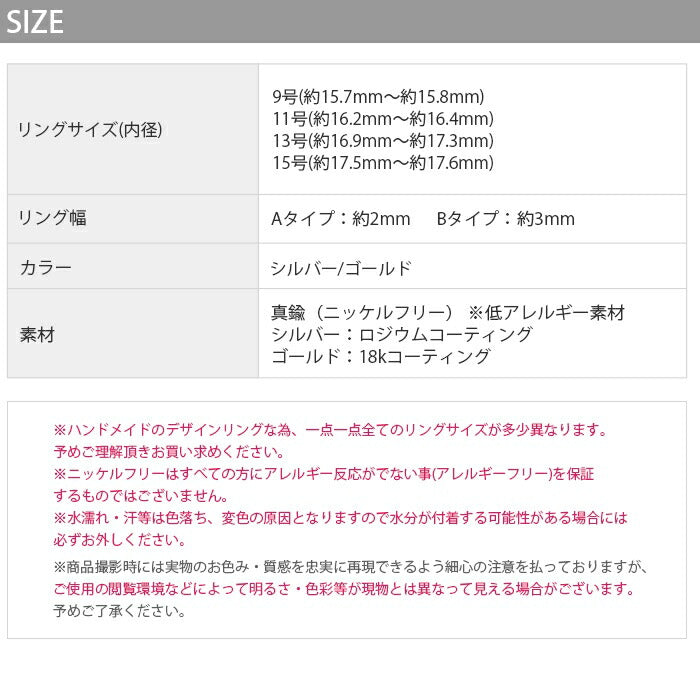 ※ハンドメイドのデザインリングな為、一点一点全てのリングサイズが多少異なりますので予めご理解頂きお買い求めください。