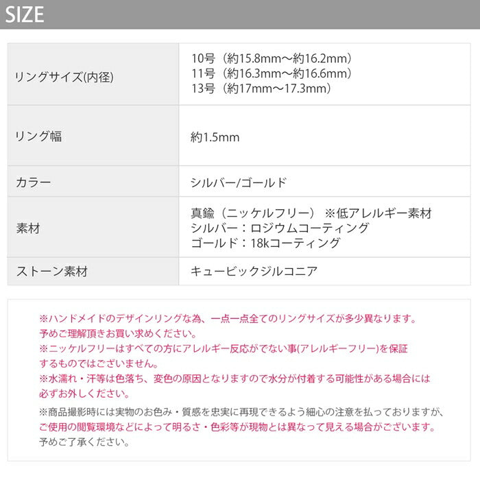 ※ハンドメイドのデザインリングな為、一点一点全てのリングサイズが多少異なりますので予めご理解頂きお買い求めください。
