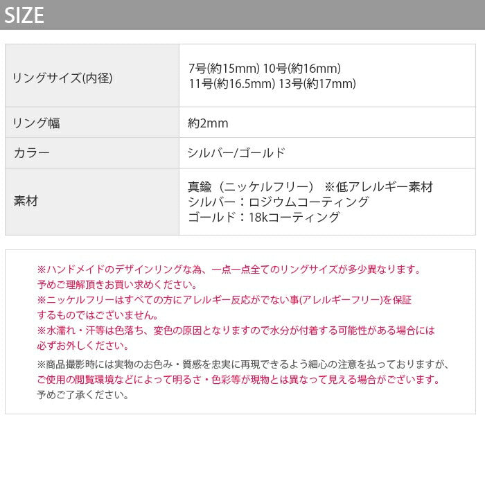 ※ハンドメイドのデザインリングな為、一点一点全てのリングサイズが多少異なりますので予めご理解頂きお買い求めください。