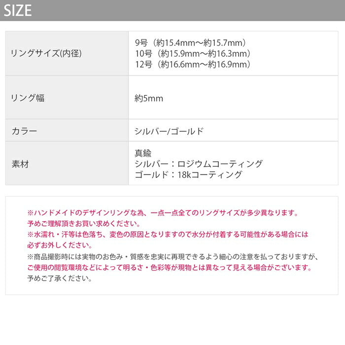 ※ハンドメイドのデザインリングな為、一点一点全てのリングサイズが多少異なりますので予めご理解頂きお買い求めください。