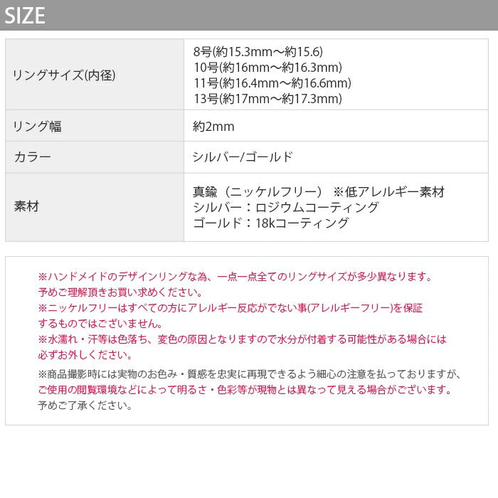 ※ハンドメイドのデザインリングな為、一点一点全てのリングサイズが多少異なりますので予めご理解頂きお買い求めください。