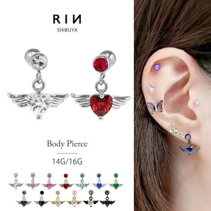 ★ s2f-62-3 ボディピアス 14G 16G 軟骨ピアス エンジェル 天使 羽 ハートピアス サージカルステンレス 金属アレルギー対応 ストレートバーベル シルバー ゴールド ピンクゴールド レッド ブラック パープル クリア 揺れる 耳 片耳用 軟骨用 耳たぶ用 なんこつぴあす