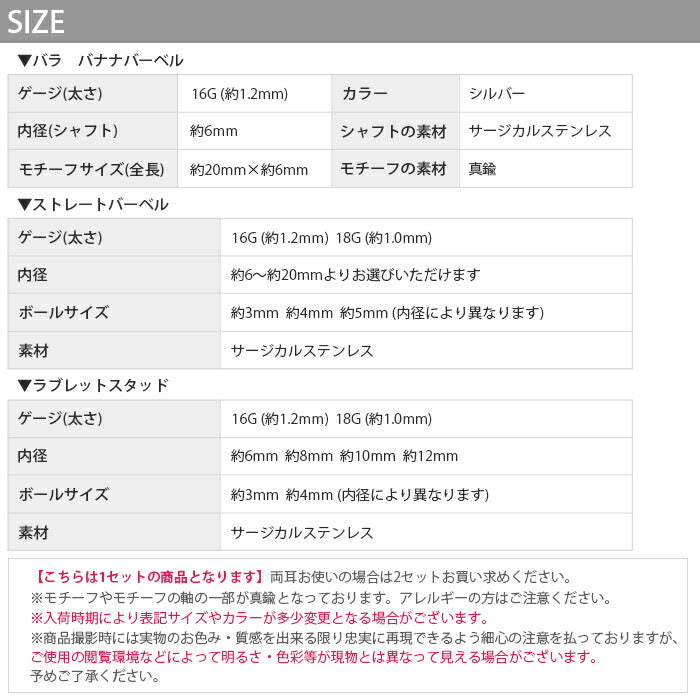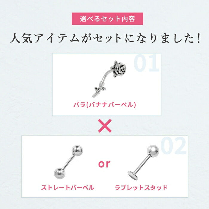 【セット】16G 18G 薔薇 バラ バナナバーベル 選べる ストレートバーベル ラブレットスタッド set-bp-004 set-bp-004