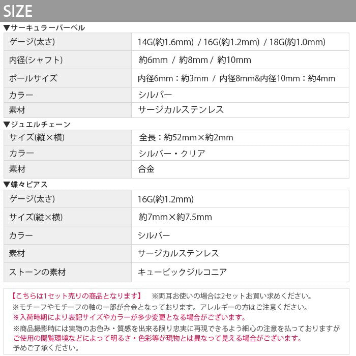14G 16G 18G 蝶 バタフライ チェーン カスタマイズアイテム セット ストレートバーベル サーキュラーバーベル 揺れる set-bp-006