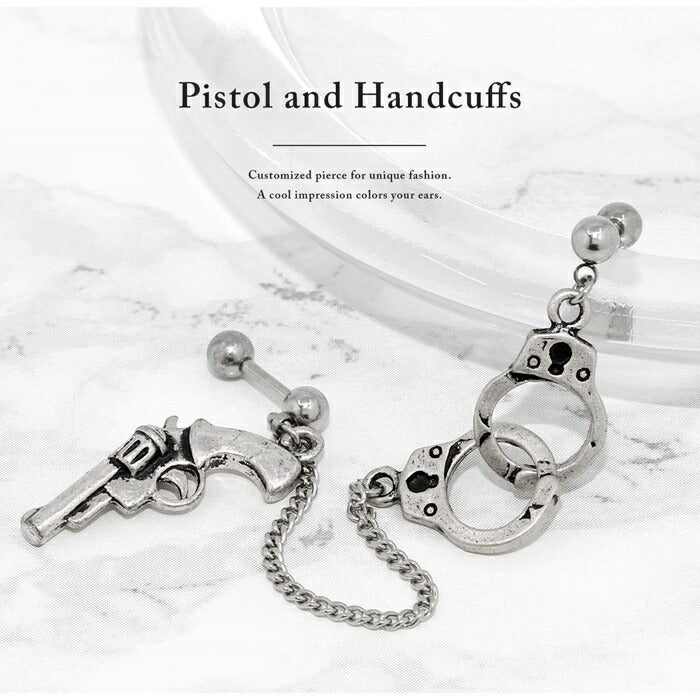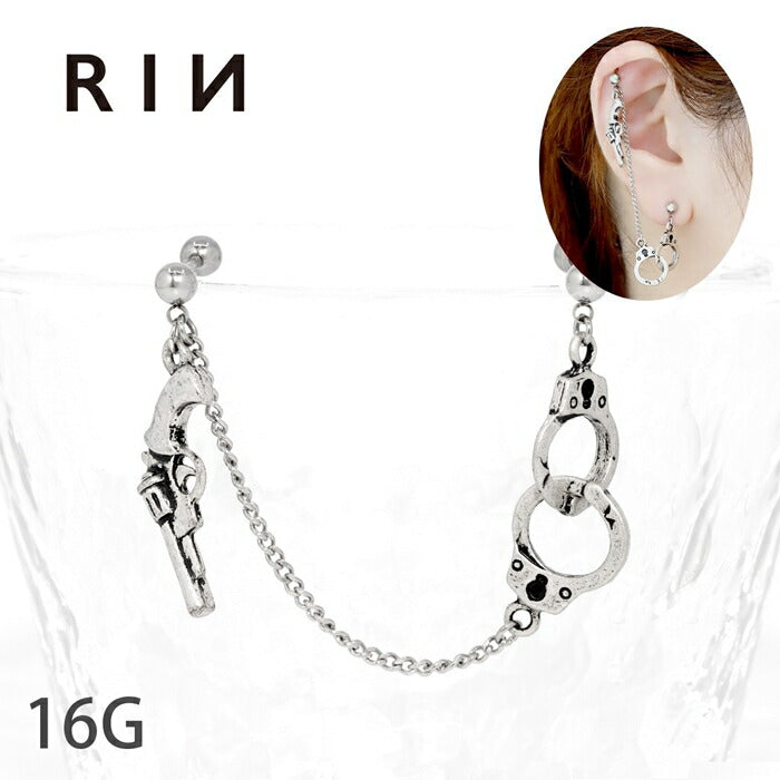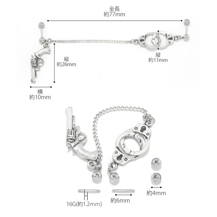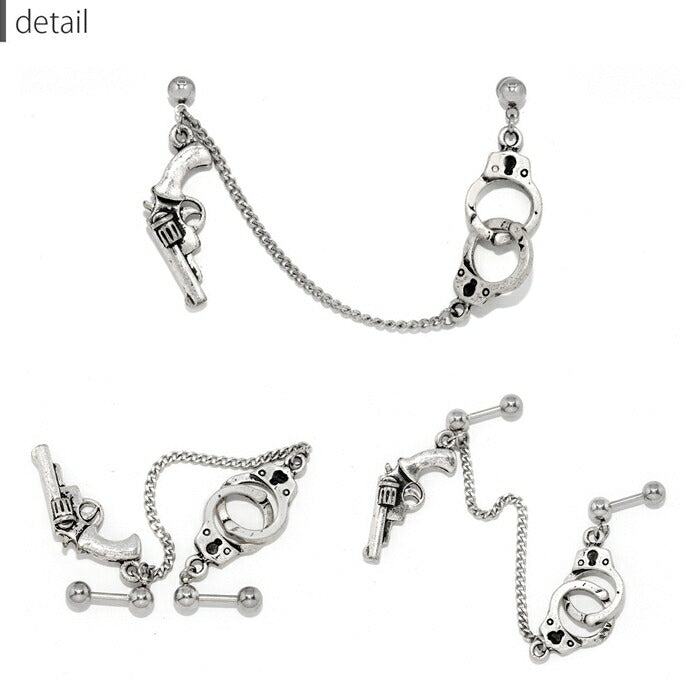 set-h752-55-8262-171 軟骨ピアス 16G ボディピアス チャーム サージカルステンレス 金属アレルギー対応 チェーン ピストル 銃 2連ピアス ストレートバーベル 片耳用 かっこいい ユニセックス メンズ 個性的 スタイリッシュ