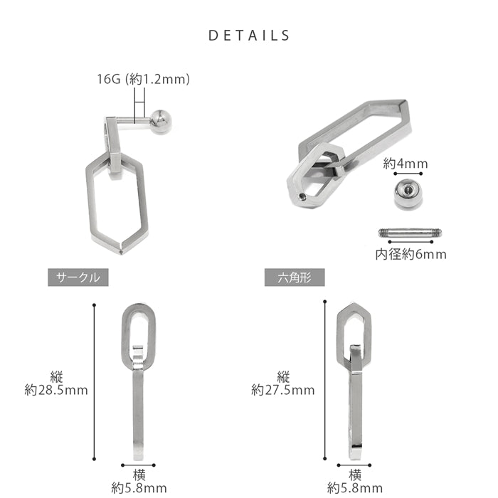 t1141-0047 軟骨ピアス 16G ボディピアス シンプル 六角形 サークル ピアス 片耳用 シンプル 金属アレルギー対応 かっこいい
