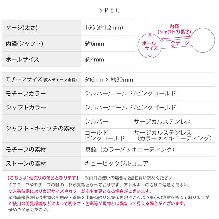 16G チェーン ダブルバーベル ストレートバーベル キュービックジルコニア 【片耳用】 軟骨1506 t1141-111