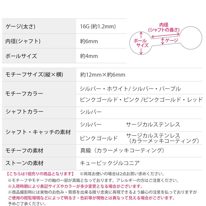 | シャフト・キャッチの素材 | シルバー:サージカルステンレス ピンクゴールド:サージカルステンレス(カラーメッキコーティング) |