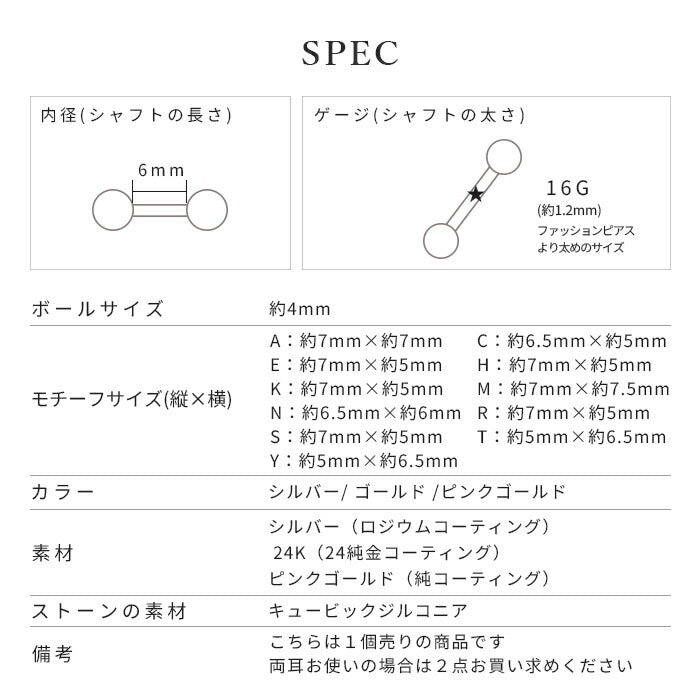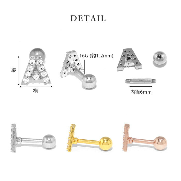 t1141-78-j ボディピアス 軟骨ピアス 16G アルファベット イニシャル ピアス 金属アレルギー対応 24k k24 24金 ストレートバーベル シンプル レディース ジュエル セカンドピアス つけっぱなし シルバー ゴールド ピンクゴールド キラキラ キュービックジルコニア 片耳用