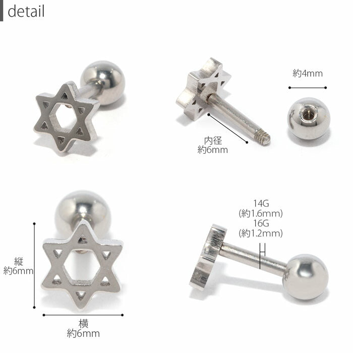【全品送料無料】 ボディピアス 16G 軟骨ピアス 14G 六芒星 星 ストレートバーベル セカンドピアス サージカルステンレス つけっぱなし 金属アレルギー ボディピ シルバー ゴールド ブラック