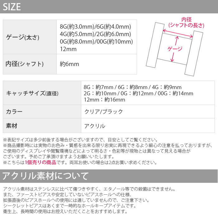 【全品送料無料】 ボディピアス 軟骨ピアス 透明ピアス 8G 6G 4G 2G 0G 00G 12mmトンネル 透明 ラージホール 拡張 アクリル メンズ ボディーピアス 耳 トンネル0009「BP」「TOM」「PS」 便利アイテム 軟骨 凛 凛りん