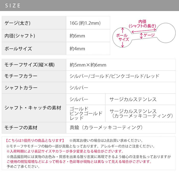 ※こちらの商品の一部カラーは、カラーのメッキコーティングを施しています。体質によって着けたままにされますと、メッキコーティングが剥がれる可能性がございます。
