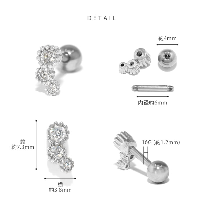 t1501-76 軟骨ピアス 金属アレルギー対応 16G ボディピアス 3連ジュエル サージカルステンレス ピアス つけっぱなし イヤーフィット キュービックジルコニア きらきら レディース さりげない 小さめ 上品 オフィス 通勤 デイリー ストレートバーベル 片耳用