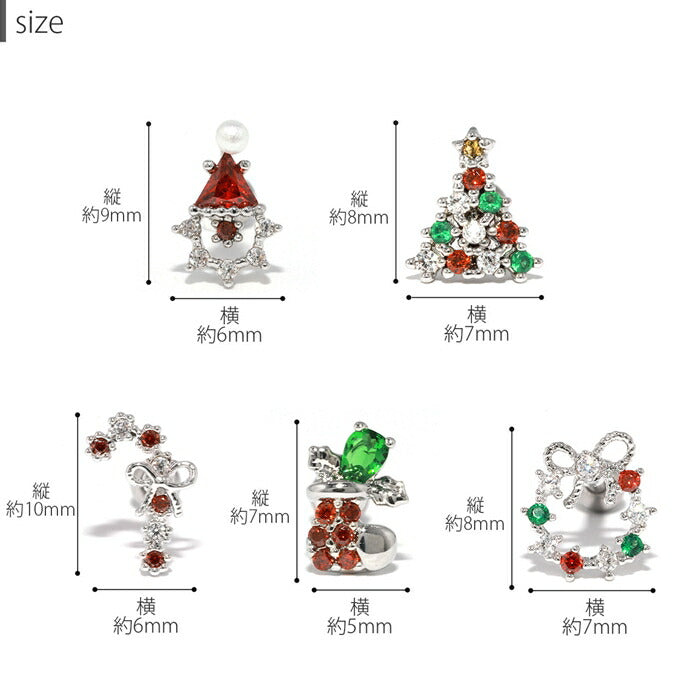 サンタ:約9mm×約6mm ツリー:約8mm×約7mm ステッキ:約10mm×約6mm ソックス:約7mm×約5mm リース:約8mm×約7mm